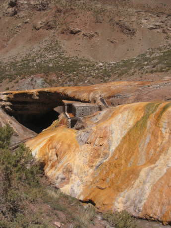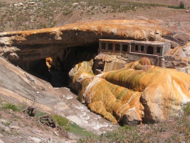 La geoforma es asombrosa, ubicada sobre el río las cuevas, pintada por el azufre de las aguas termales que brotan de la superficie. En ella, se construyó un hotel, con baños termales, que luego fue abandonado. Desde el año 2006 el acceso se encuentra prohibido por peligro de derrumbe y para protegerlo, antes se podía acceder y visitar las ruinas de lo que fue el hotel.